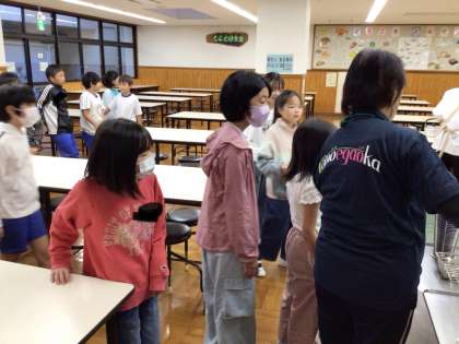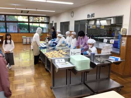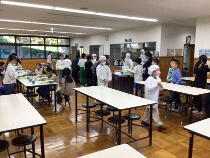 朝食の準備をしています。食事係が準備します。それ以外の子はお盆を持って並んで朝食を受け取ります。