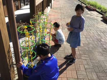すっかり肌寒くなってきました。今週もボランティアの方が新しい花を生けてくださいました。1年生は毎日忘れずに朝顔に水をあげています。