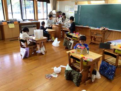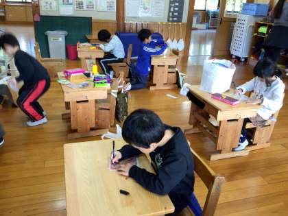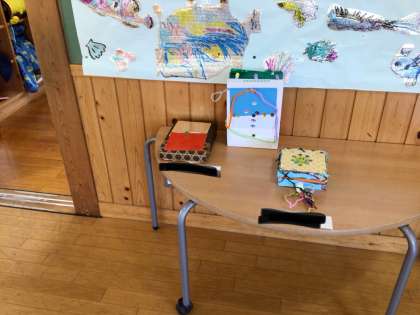 今日は図工に取り組んでいる学年が多いようです。1年生は宝箱を作りました。できた子は作品を廊下に並べて、新しい絵を描いています。