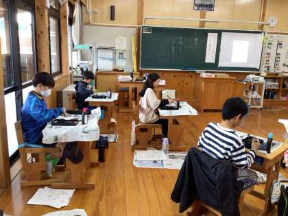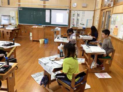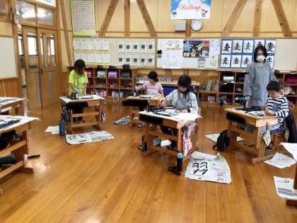 折れるところで筆を止めることに注意しながら、「らん」という字を練習しています。