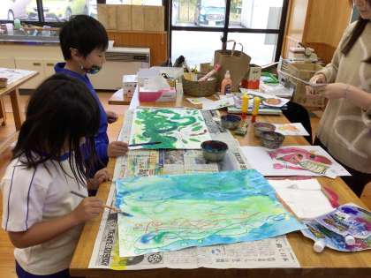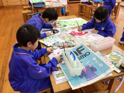 読書感想画に取り組んでいます。クレヨンや水彩絵具を併用して楽しい画面にしています。