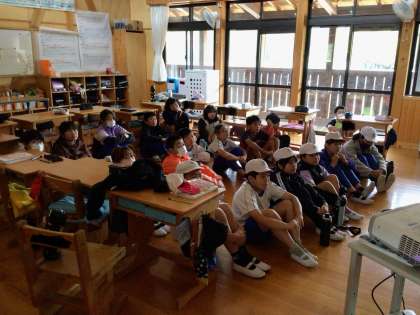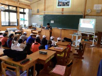 フットサルについて教室で動画を見て学習しています。このあと実際に運動場に出て、学んだことを実践しました。