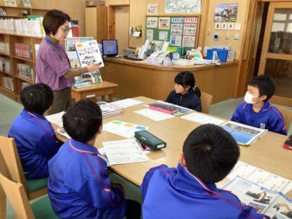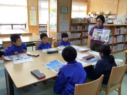 1年生は司書さんに、本を利用して、知りたいことを早く正確に知るための方法を教えてもらいました。