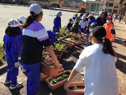 先週つくった土に、パンジーなどの苗をうえました。プランターは、チームごとに工夫しながら並べていきました。