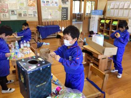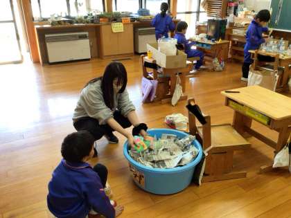 こども園の子を迎えてのお祭りの準備をしています。園の子たちが喜んでくれる様子を想像しながら楽しく遊べるゲームを作っています。