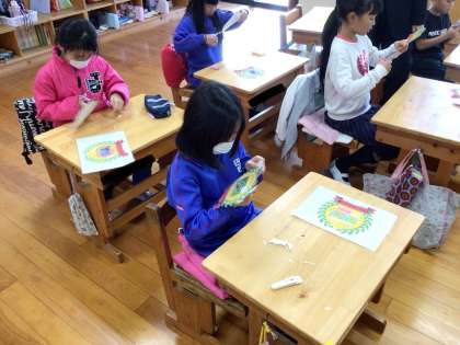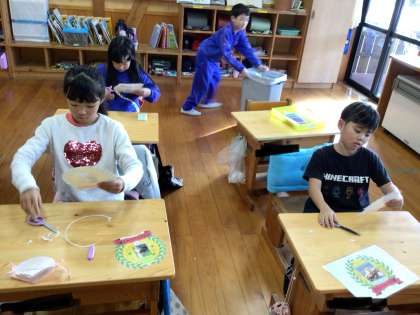 「ビーバーの大工事」の発展学習で図鑑を使って動物のことを調べて、クイズにしました。他の学年の子がたくさんクイズに答えてくれたので、お礼にメダルを作っています。