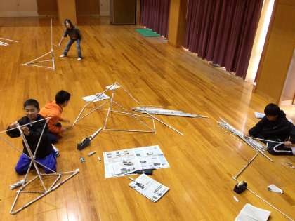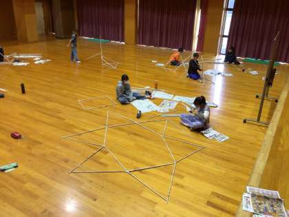 「組んで立てて つなぐんぐん」に取り組んでいます。多目的室いっぱいに広がって、新聞紙を丸めて大きな作品を作っています。楽しそうです。