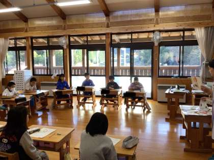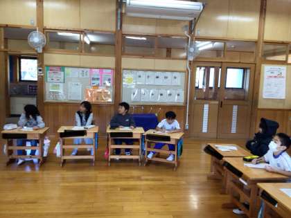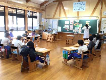 栄養士さんによる授業です。バランスよく食べることの大切さについて学習しています。