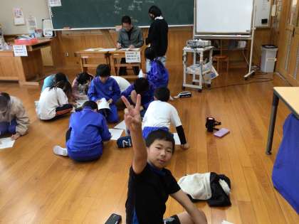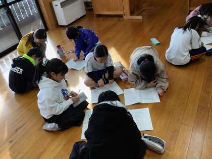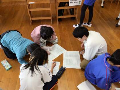 4、5年生が20周年を祝う会で披露する寸劇の練習をしています。各班に分かれてセリフの読み合わせをしています。