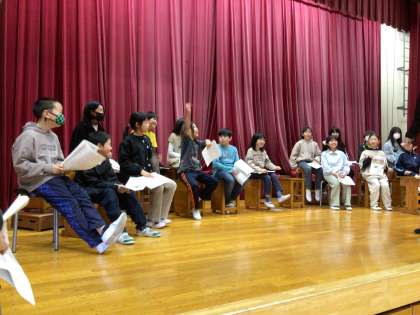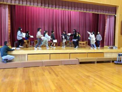 4、5年生の練習の様子です。初めて舞台で練習しました。楽しそうに取り組んでいます。