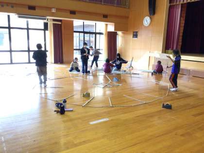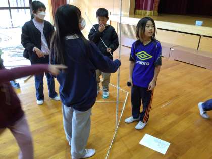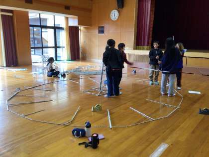 新聞紙で4年生みんなが入れる大きな家を作ろうと、設計図を描きながらみんなで話し合って作っています。