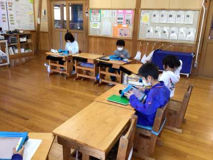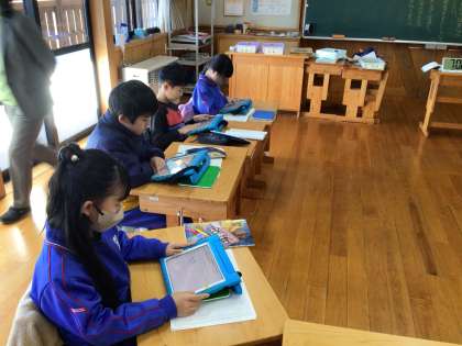 キュビナの研究授業をしました。漢字の音読み訓読みについて学習したことをキュビナを使って確認しています。