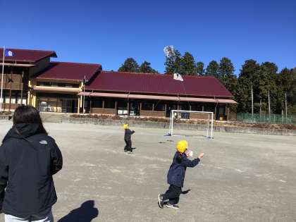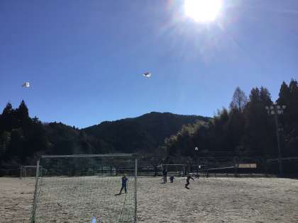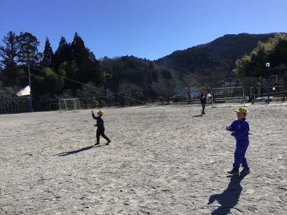 生活の時間に作った凧に図工の時間を使って絵を描きました。運動場であげてみました。高くあがっています。