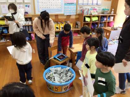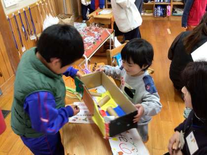 こども園の子たちを招待してお祭りをしました。ゲームや景品がとても立派です。はじめの会も元気いっぱいに行いました。
