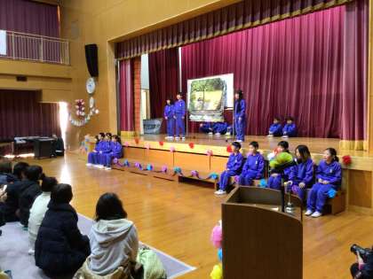 総合学習で調べたことを元気一杯に発表しました。寸劇もまじえて興味深い発表でした。音楽もとても楽しくきけました。リハーサルからさらに声も大きくなり、やる気が伝わってきて嬉しくなりました。