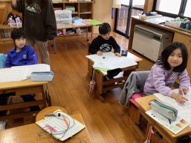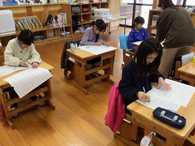 漢字の練習をしています。苦労しながらも、一生懸命に取り組んでいます。