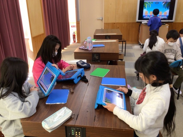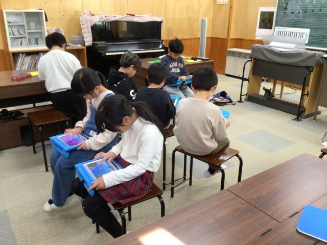 音楽に関する記号をタブレットのカフートというアプリを使って覚えています。自信のある子は答えの書いてある黒板に背を向けて挑戦しています。