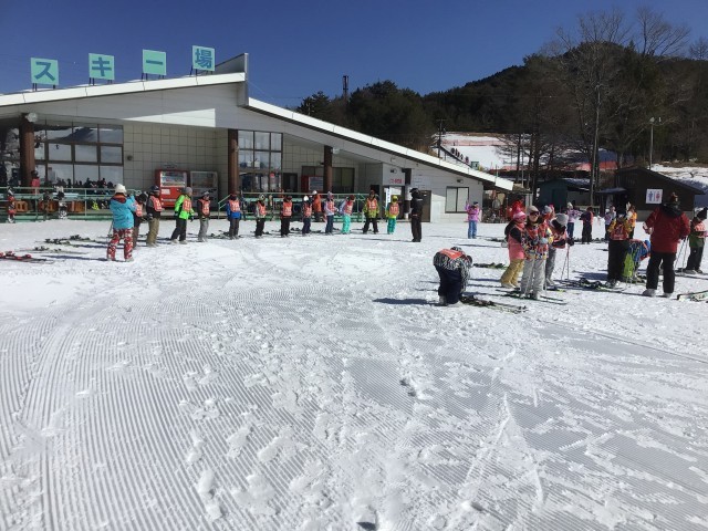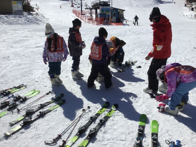 スキーも各班に分かれて活動開始です。準備体操をしたりスキーの付け方などの説明を聞いたりしています。