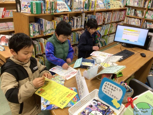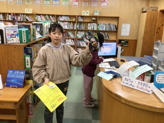 おはようございます。昨日の図書集会でもらった2冊かりられるシートをつかって本をかりています。かりた冊数分のシールをシートに貼っています。