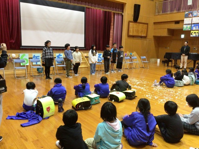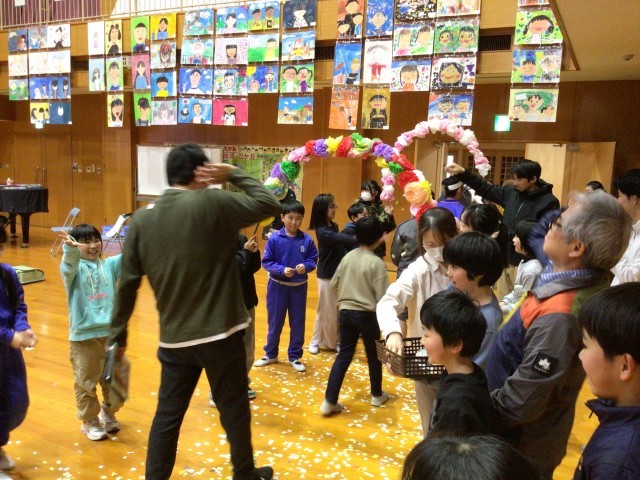 6年生からお礼の言葉をもらいました。退場はアーチと紙吹雪で送り出しました。この会は、5年生が裏方となって企画や進行などをしました。会の最後に5年生から下級生にむけて協力のお礼を述べました。来年度、頼もしい最高学年になってくれそうです。
