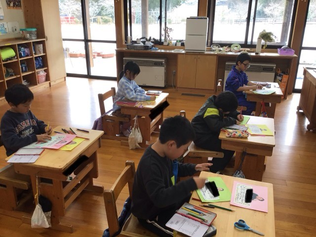 入学式の日に新入生の教室を飾る掲示物を、お祝いのメッセージとともに作成しています。