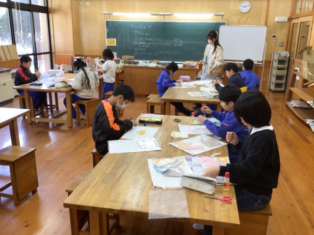 紙版画の続きです。絵を切り取って厚紙に貼り付けています。