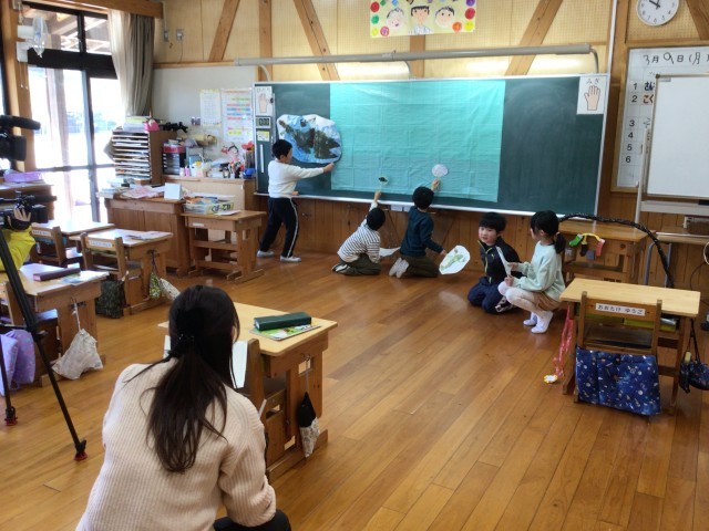 僕らの学び舎の撮影をしています。今日撮影したものは、6月1日にひまわりネットワークで放送されます。画像では、2年生の好きな給食発表と、1年生は国語の授業「スイミー」の授業を撮影しています。