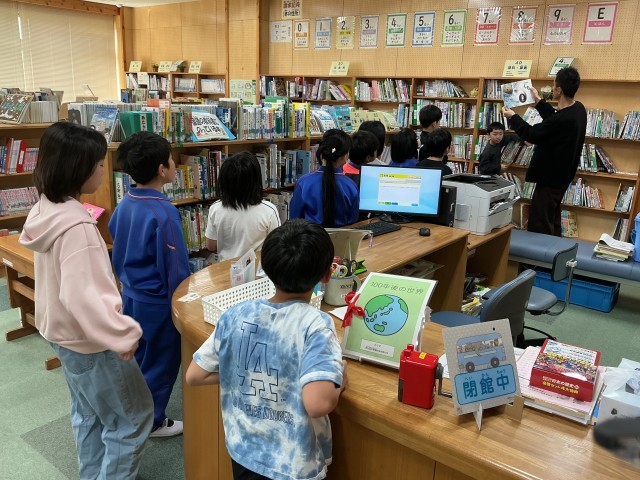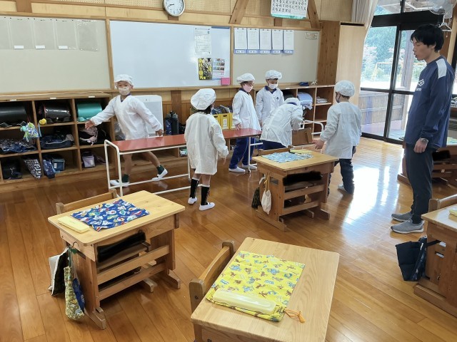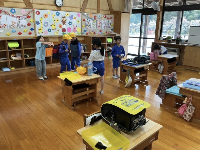 1年生は朝の準備をしています。少しづつ上手にできるようになってきました。4年生は図書室の使い方の説明を聞いています。2年生は今日から始まる給食の準備の手順について確認しています。