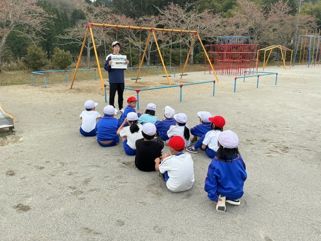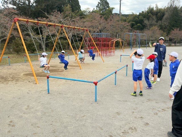 遊具の安全な使い方の学習をしています。1年生は正しい使い方を理解してから遊びます。