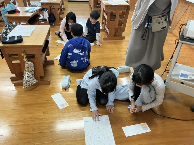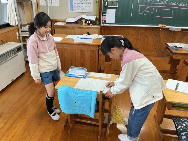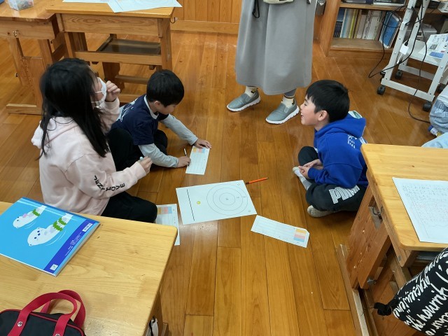 点数が書いてあるエリアにおはじきを入れています。何点のエリアにいくつおはじきが入ったか計算します。楽しみながら掛け算を勉強しています。