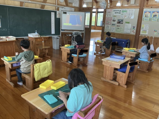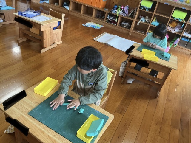 動画を見ながら粘土が柔らかくなるまでこねています。楽しそうです。