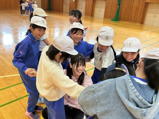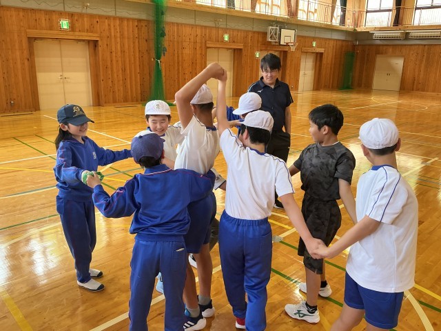 体ほぐしのために、人間知恵の輪に取り組んでいます。先生も入って楽しそうに取り組んでいます。