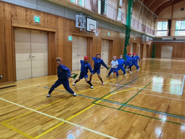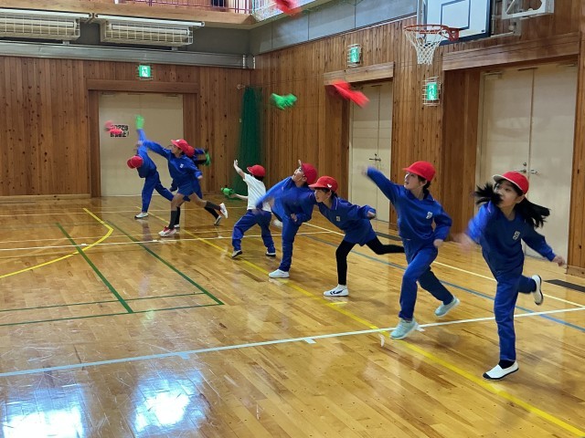 体力テストでボール投げがあります。今日の体育はボール投げの練習です。小さいボールを包んだタオルを弾みをつけて投げて練習しています。