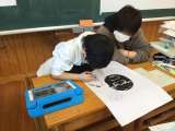 2年生が紙版画の作品を画用紙に貼って絵を描いていました。上手にできたかな。