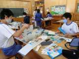 図工室で作品づくりをしている6年生です。板を糸のこで切って思い思いの形にし、組み...