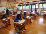 1年生教室の給食準備の様子です。6年生と保健の先生がお手伝いに来てくれています。...