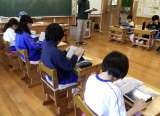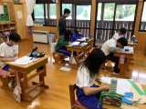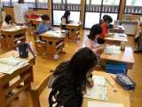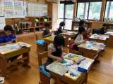 朝の活動の時間です。 1、2年生の教室前の廊下のワークスペースでは、子どもたちが...