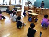 低学年の音楽の様子です。ドラえもんの音楽に合わせてカスタネットをたたいています。