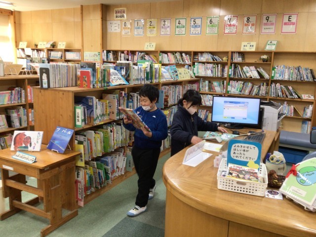 朝の図書室の様子です。本を返しにきた1年生が、「今日は2年生に紙芝居を見せるんだ...