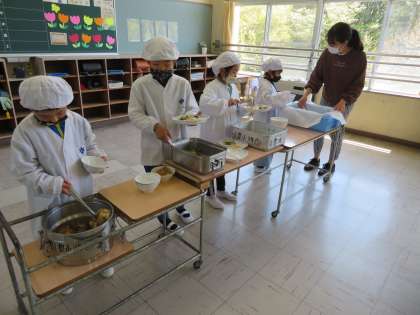 給食が始まりました。 公開日 2021/04/07 更新日 2021/04/07 お知らせ 令和3年度最初の給食は、「肉じゃが、豆腐しんじょのあんかけ、キャベツの昆布あえ、ご飯、牛乳」でした。 3年生はたった4人ですが、慣れた手つきで配膳を要領よく行っていて感心しました。 1年生も、小学校で食べる初めての給食をおいしくいただきました。
