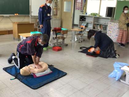 児童が下校した後、中消防署松平出張所から鈴木所長さん、藤本さんを講師に招いて緊急時の対応について講習を受けました。
