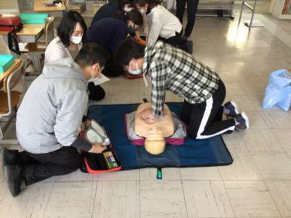 まず初めに、胸骨圧迫(心臓マッサージ)の仕方やAEDの使用法について学びました(通常の呼吸でなければ即刻胸骨圧迫を開始し、救急車が到着するまで続けるのだそうです)。
