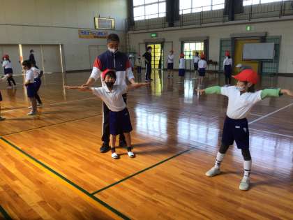 運動会で高学年が発表するダンスの練習のため、しばらくの間4・5・6年合同で体育の授業を行います。今日はダンスをする上で基礎となるアイソレーションを行いました。