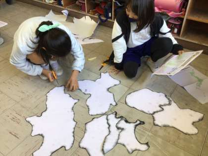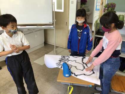 4/21 巨大日本地図作成中!(4年生 社会科) 公開日 2021/04/21 更新日 2021/04/21 お知らせ 4年生は都道府県について勉強しています。今は、巨大日本地図を作り、都道府県ごとに切り分けています。北海道は両手をいっぱい広げたぐらいの大きさです!子どもたちもノリノリで作業に取り組んでいます。 今度の授業参観で使うそうなのですが、どんな授業になるのか楽しみです。