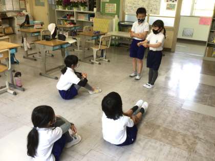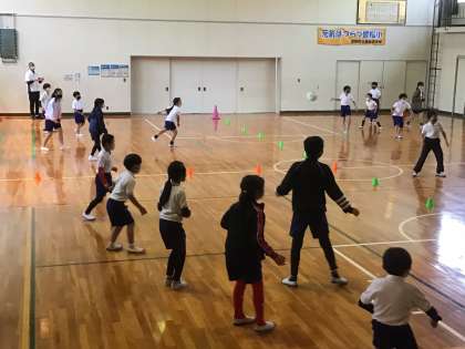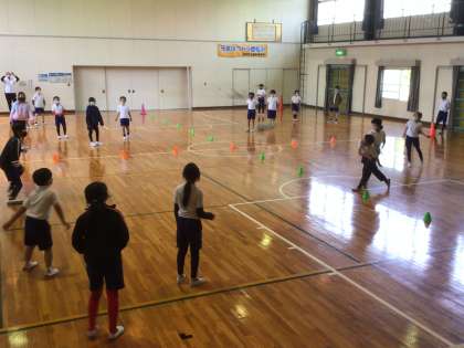 4/30 1年生を迎える会(全校) その2 公開日 2021/04/30 更新日 2021/04/30 お知らせ 次に赤白に分かれて、体育館で「無限ドッジボール」、教室で「ジェスチャーゲーム」をしました。 「無限ドッジボール」は四チームの対抗戦です。コートを四つに区切り、当てられたら相手チームのコートに移動します。ボールも二つ使うのでスリル満点です。 「ジェスチャーゲーム」は、紙に書かれたジャンルの中で出題者が好きなものをジェスチャーで伝え、その答えを当てるゲームです。