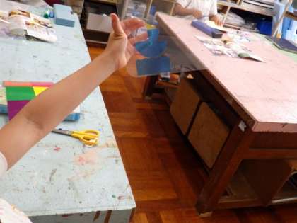 透明なプラスチックの板でできたうちわに、色とりどりのセロハンで飾りをつけます。 青い海にうかぶヨットやかわいい花々など、一人一人が思い思いのデザインを考えて作ります。光を透かして見る色がとてもきれいです。できあがりが楽しみですね。