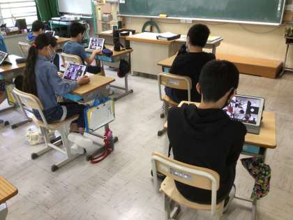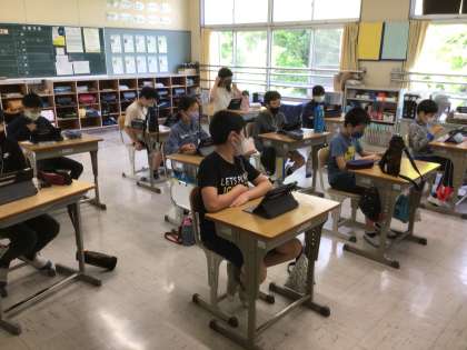 今日は、5・6年生はタブレットを使って、オンラインで朝の会を行いました。