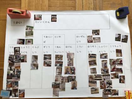 豊松小学校の図面に、学校探検で写してきた写真をはって、学校の地図を地図を完成しました。