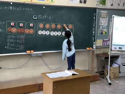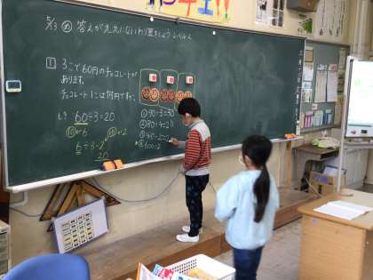 「60÷3」のように、わられる数が大きく答えが九九の表にないわり算です。お金のモデルを使って「10円玉6枚」を3人で分けるという考え方について知りました。