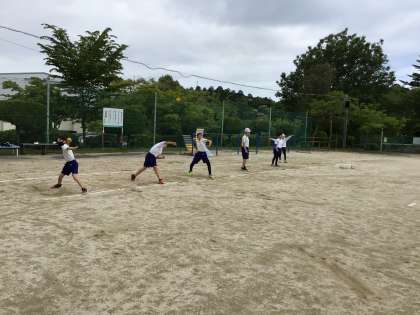 今、多くの学年の体育は、今月末に行う体力テストの練習を行っています。今日、5・6年生はソフトボール投げの練習をしました。